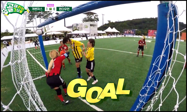 개벤져스의 김승혜의 절묘한 센터링킥에 이은 이은형의 곡예와도 같은 헤딩슛의 멋진 세트플레이에 의해서, 개벤져스가 첫골을 성공시켰답니다.